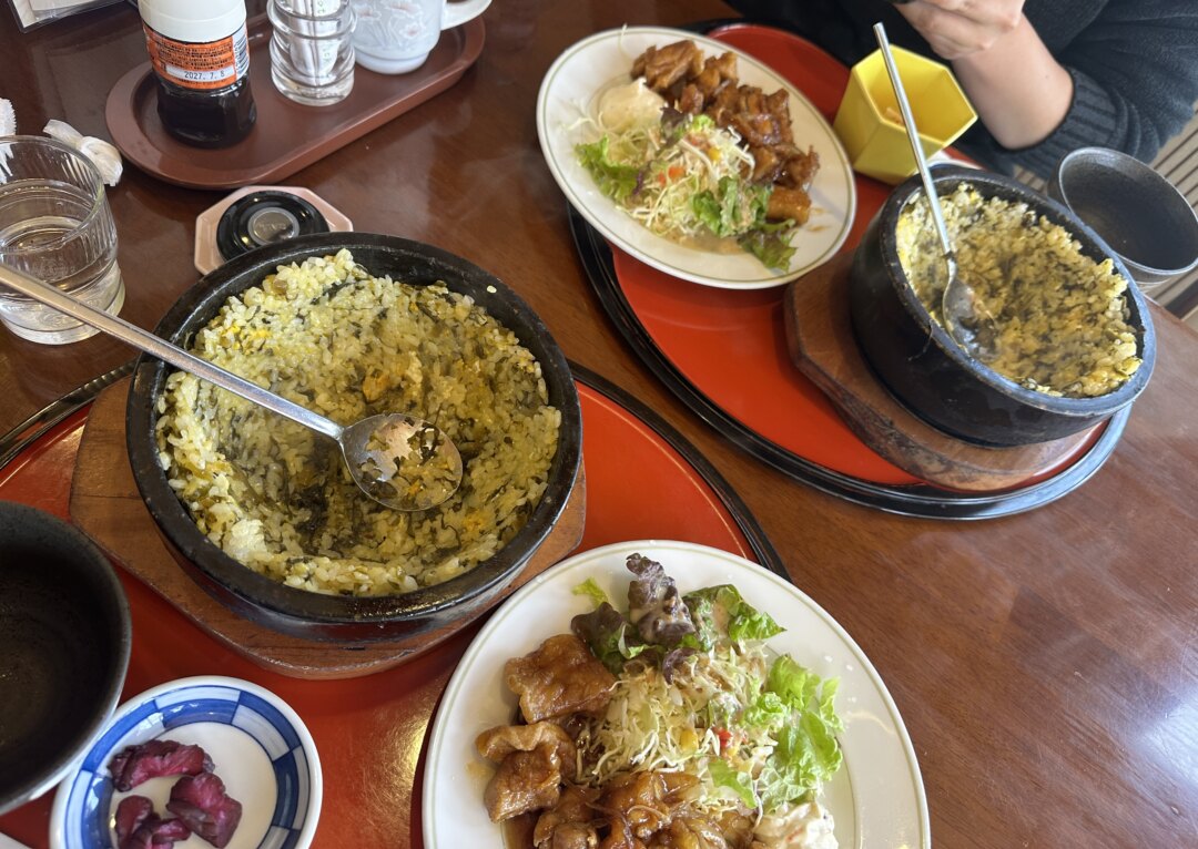 高菜飯はおこげを作るためにしっかり混ぜて石鍋に貼り付けてしばし待ちます